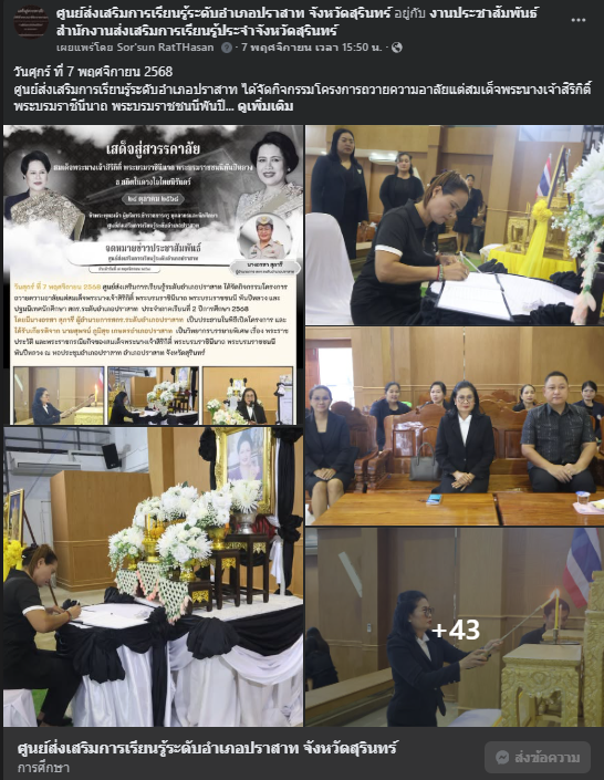 วันศุกร์ ที่ 7 พฤศจิกายน 2568 ศูนย์ส่งเสริมการเรียนรู้ระดับอำเภอปราสาท ได้จัดกิจกรรมโครงการถวายความอาลัยแต่สมเด็จพระนางเจ้าสิริกิติ์ พระบรมราชินีนาถ พระบรมราชชนนีพันปีหลวง และปฐมนิเทศนักศึกษา สกร.ระดับอำเภอปราสาท ประจำภาคเรียนที่ 2 ปีการศึกษา 2568 โดยมีนางอรสา สุภารี ผู้อำนวยการสกร.ระดับอำเภอปราสาท เป็นประธานในพิธีเปิดโครงการ และ ได้รับเกียรติจาก นายสุพจน์ ภูมิสุข เกษตรอำเภอปราสาท เป็นวิทยากรบรรยายพิเศษ เรื่อง พระราชประวัติและพระราชกรณียกิจของสมเด็จพระนางเจ้าสิริกิติ์ พระบรมราชินีนาถ พระบรมราชชนนีพันปีหลวง ณ หอประชุมอำเภอปราสาท อำเภอปราสาท จังหวัดสุรินทร์
